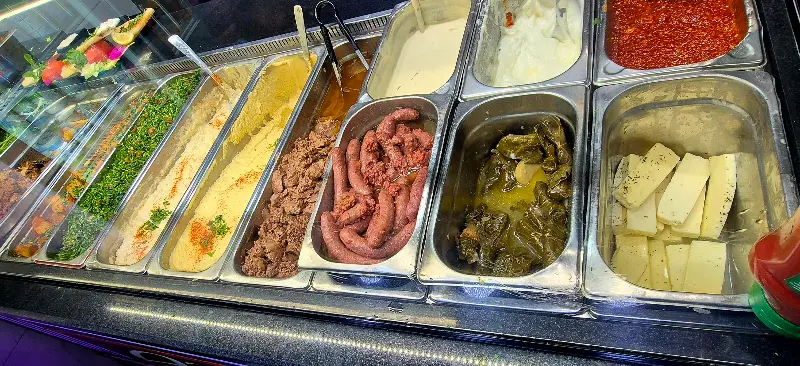 사진 속 중동 요리는 다채로운 샐러드와 소스를 곁들여 더욱 풍성하게 즐길 수 있습니다. 각각의 샐러드와 소스는 요리의 풍미를 더하고, 새로운 맛의 경험을 선사합니다. 아잠 레스토랑은 다양한 선택지를 제공하여 고객들이 자신만의 취향에 맞는 요리를 즐길 수 있도록 배려합니다.