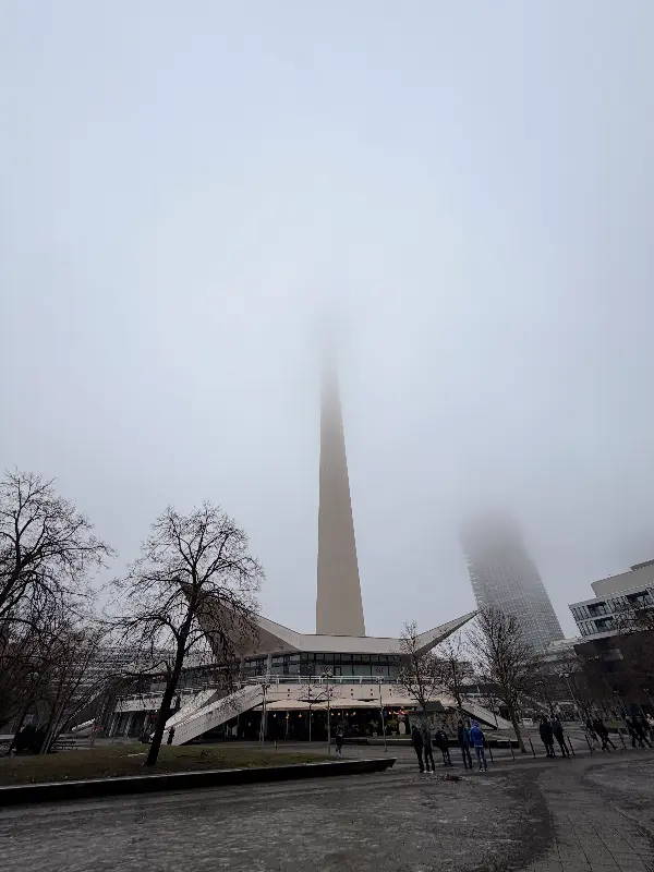안개 낀 날의 베를린 TV 타워. 날씨에 따라 전망이 제한될 수 있다는 점을 고려해야 한다.