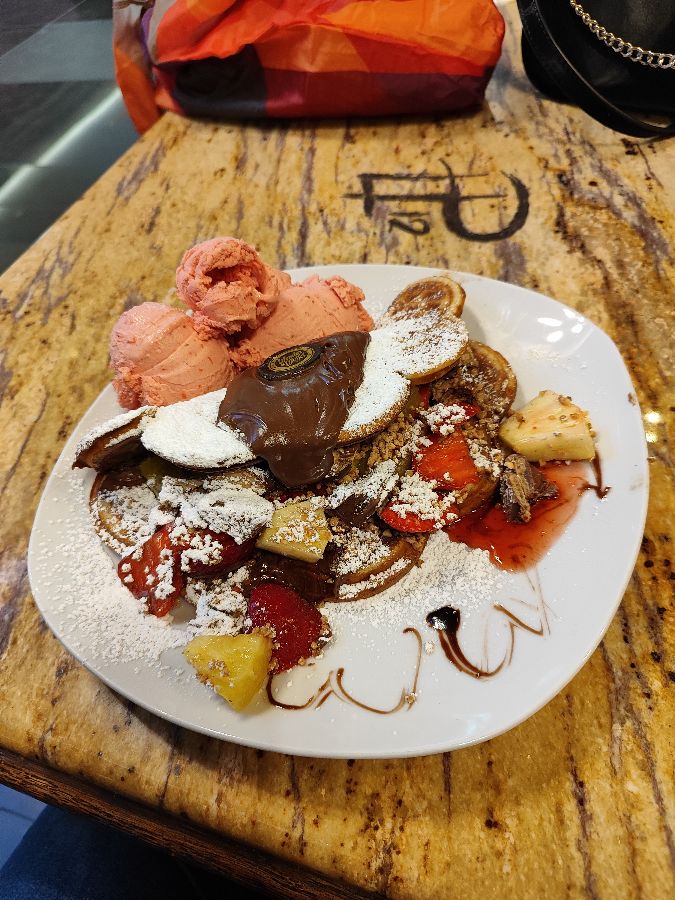 베를린의 쇼핑몰 안에 위치한 WonderWaffel은 늘 사람들로 북적입니다. 북적이는 인파 속에서도 달콤한 와플 냄새는 자연스레 발걸음을 멈추게 하는 마법 같은 힘을 가졌죠. 매장 안으로 들어서는 순간, 고소하고 달콤한 향이 코끝을 스치며 마치 동화 속 과자집에 들어선 듯한 설렘을 안겨줍니다. 갓 구워낸 와플과 다채로운 토핑들이 만들어내는 시각적인 향연은, 그 자체로도 하나의 멋진 풍경을 이룹니다. 메뉴판을 들여다보면, 그야말로 선택의 폭이 넓어 무엇을 고를지 행복한 고민에 빠지게 됩니다. 눈을 사로잡는 화려한 비주얼과, 익숙하면서도 이국적인 재료들의 조합은 평범한 디저트 가게를 넘어선 특별함을 느끼게 합니다.