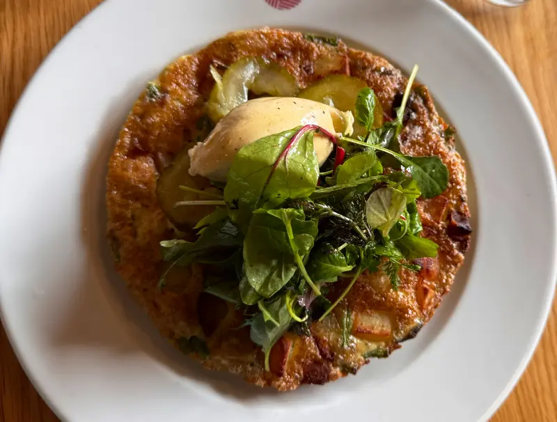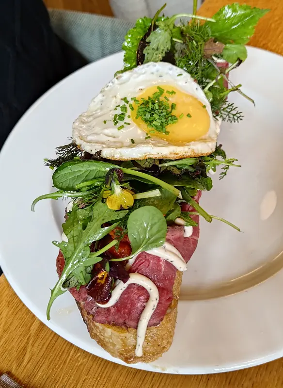 스테이크 타르타르 오픈 샌드위치는 신선한 야채와 윤기가 흐르는 스테이크가 조화롭게 어우러져 있었고, 그 위에 올려진 반숙 계란은 식욕을 더욱 자극했다. 특히, 섬세하게 뿌려진 소스와 허브는 음식의 풍미를 더해주는 듯했다.