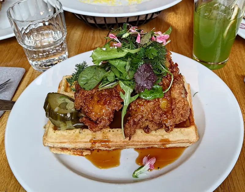 치킨 와플은 촉촉한 와플 위에 바삭하게 튀겨진 치킨이 올려져 있었는데, 달콤함과 짭짤함의 조화가 환상적이었다. 겉은 바삭하고 속은 촉촉한 치킨의 식감 또한 훌륭했다. 메뉴 하나하나에서 요리에 대한 깊은 애정과 비범한 솜씨가 느껴졌다. 단순히 재료를 조합하는 것이 아니라, 진정한 연구를 통해 만들어낸 맛이라는 것을 알 수 있었다.