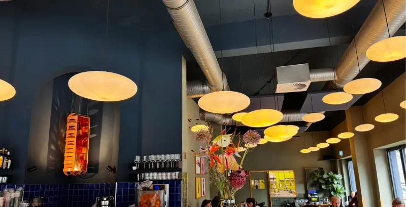천장에는 독특한 디자인의 조명이 은은하게 빛나고 있었고, 벽면을 가득 채운 그림들은 공간에 생기를 불어넣었다. 테이블 간 간격은 다소 좁았지만, 오히려 옆 테이블 사람들과 함께 활기찬 분위기를 공유하는 듯한 느낌을 받았다. 사진에서 보이는 천장의 둥근 조명들이 따뜻한 느낌을 더해주고, 벽면에 걸린 액자들은 예술적인 감성을 자극한다.