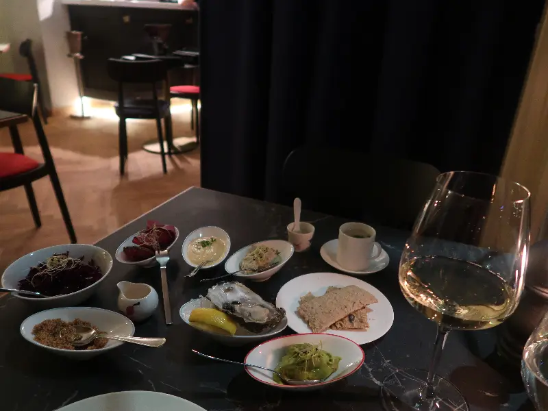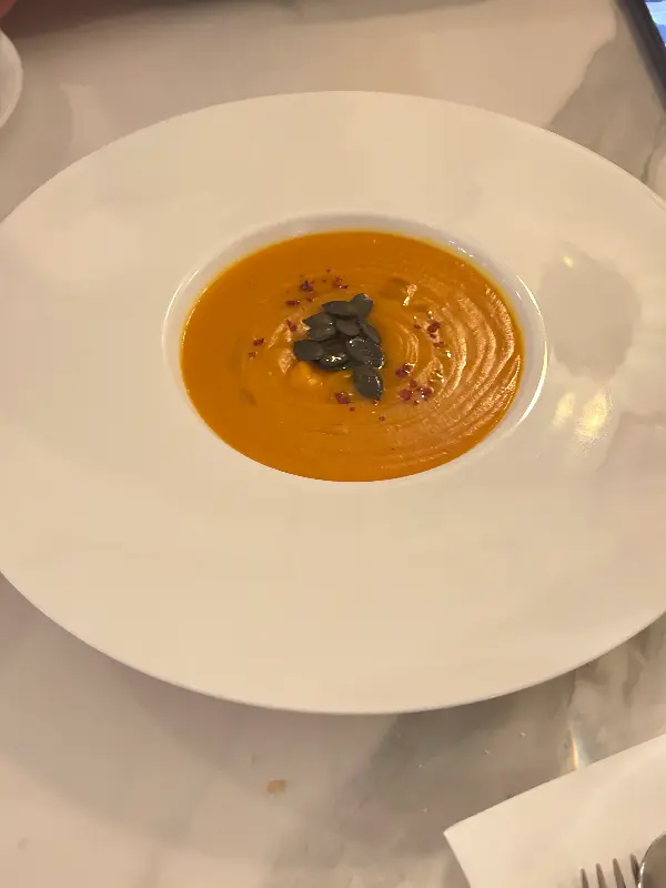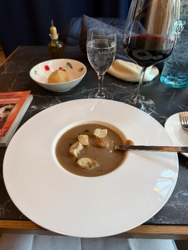 첫 번째 요리는 따뜻한 스프였습니다. 부드러운 질감과 깊은 풍미가 입안 가득 퍼지면서, 차가운 베를린의 밤공기에 얼어붙었던 몸과 마음을 따스하게 녹여주었습니다. 스프 위에 올려진 바삭한 크루통은 식감의 재미를 더했고, 곁들여 나온 빵은 스프의 풍미를 더욱 깊게 느낄 수 있도록 도와주었습니다. 사진에서 보이는 것처럼, 테이블 세팅 하나하나에도 정성이 느껴져, 식사하는 내내 기분 좋은 만족감을 느낄 수 있었습니다.