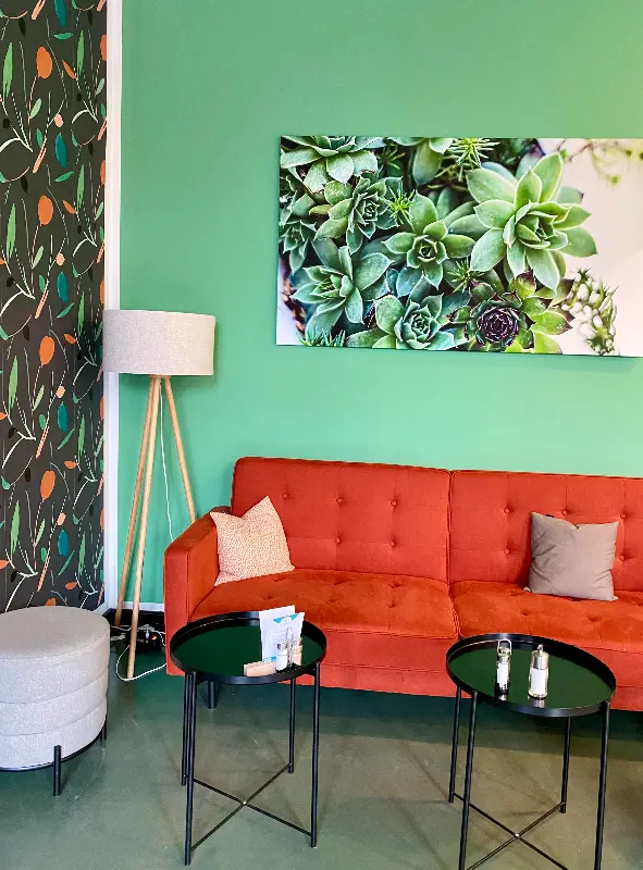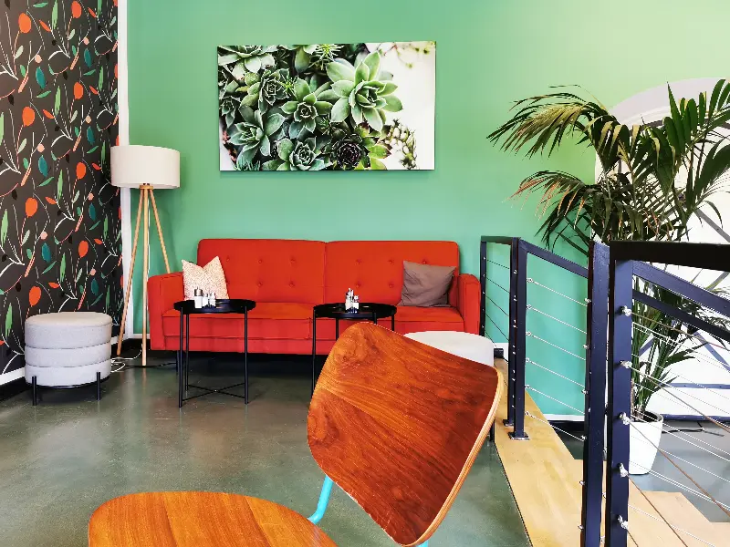 전체적으로 밝고 따뜻한 색감을 사용하여 편안함을 더했고, 곳곳에 놓인 아기자기한 소품들이 공간에 생기를 불어넣습니다. 특히 눈에 띄는 것은 벽면에 걸린 그림과 사진들입니다. 추상적인 그림부터 풍경 사진까지, 다양한 작품들이 갤러리 못지않은 분위기를 연출합니다. 벽면의 은은한 녹색과 붉은색 문이 인상적이며, 이는 공간에 활력을 더합니다.