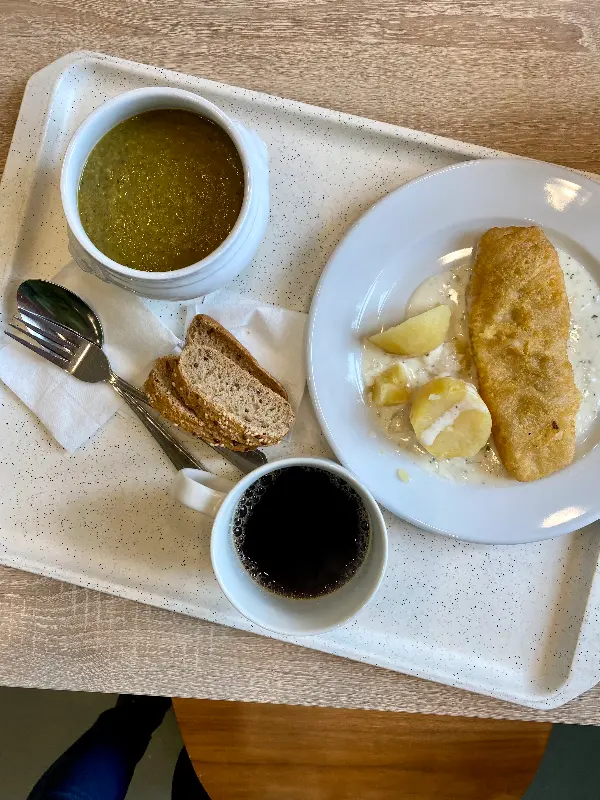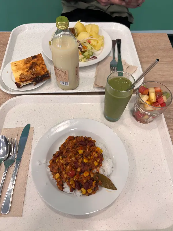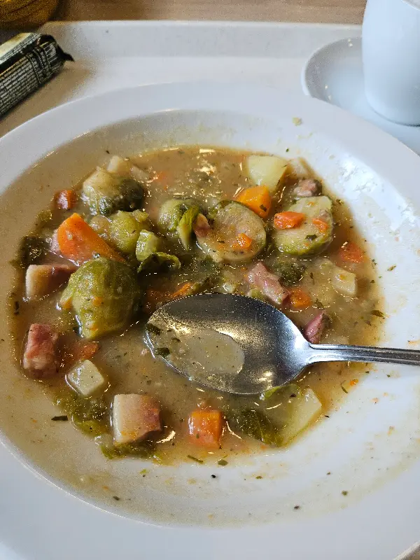 햄, 치즈, 토마토를 넣은 스크램블 에그는 갓 조리되어 신선한 과일과 채소로 예쁘게 장식되어 나옵니다. 그린 스무디 또한 신선하고 건강한 맛을 자랑합니다. 브뤼셀 스프라우트 스튜는 맛있고 가격도 적당하며, 카푸치노와 스무디도 추천할 만합니다. 매일 수프와 두 가지 “오늘의 요리”가 준비되어 있어, 매일 방문해도 질리지 않습니다.