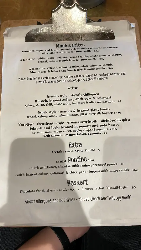 메뉴판을 살펴보면, ‘à la crème’, ‘Spanish style’ 등 다양한 홍합 요리 옵션이 눈에 띕니다. 직원들은 메뉴에 대해 잘 알고 있으며, 처음 방문하는 손님들에게도 친절하게 설명을 제공합니다. 메뉴 선택에 어려움을 느낀다면, 주저하지 말고 직원에게 추천을 요청해보세요. 당신의 취향에 맞는 최고의 홍합 요리를 찾아줄 것입니다.