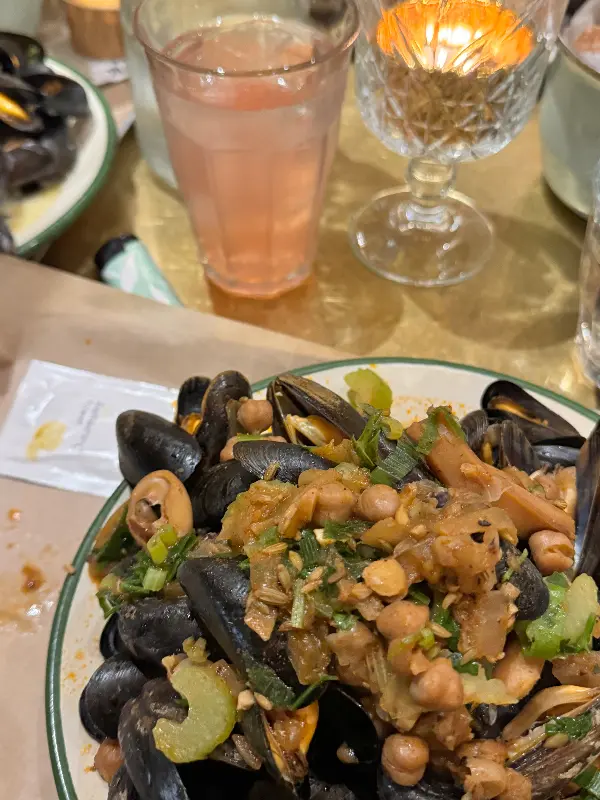 테이블 위에 놓인 홍합 요리의 모습입니다. 촛불이 은은하게 빛나며 로맨틱한 분위기를 더합니다.
