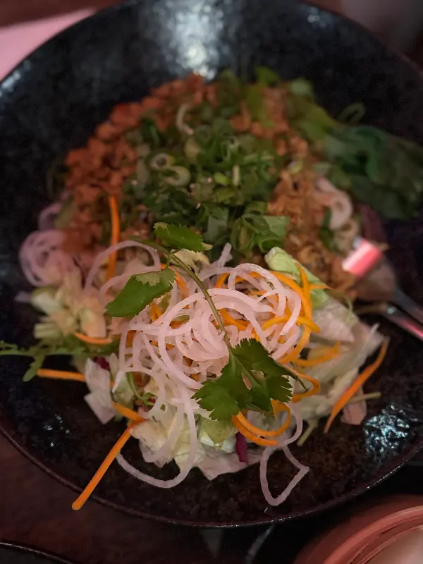 신선한 채소와 특제 소스가 어우러진 샐러드는 입맛을 돋우는 데 제격입니다. 아삭아삭 씹히는 채소의 식감과 상큼한 소스는, 다음 요리에 대한 기대감을 한껏 높여줍니다. 샐러드 위에는 тонкие рисовые нити (얇은 쌀국수)가 얹어져 있어 독특한 식감을 더합니다.