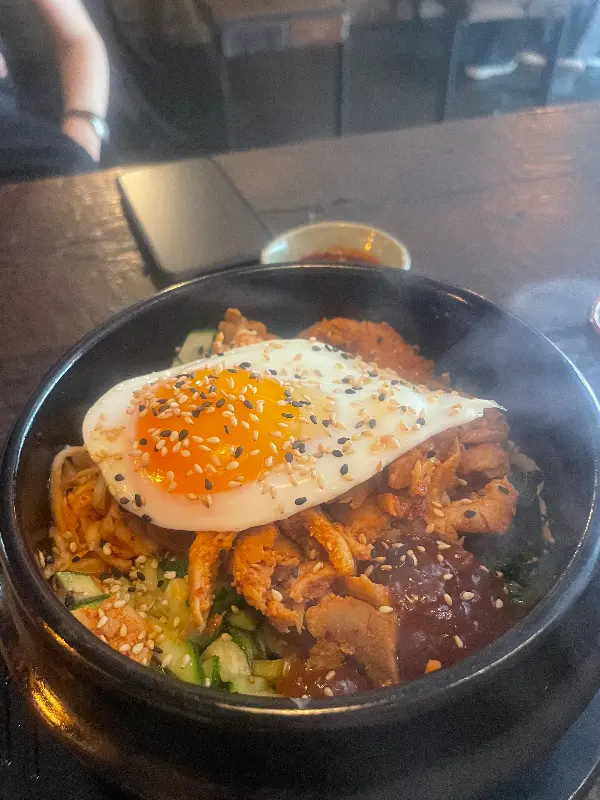 치코기에서 가장 먼저 눈길을 사로잡는 메뉴는 단연 돌솥 비빔밥입니다. 뜨겁게 달궈진 돌솥 안에는 신선한 채소와 고기가 푸짐하게 담겨 있고, 그 위에 곱게 올려진 계란 프라이는 시각적인 만족감을 더합니다.