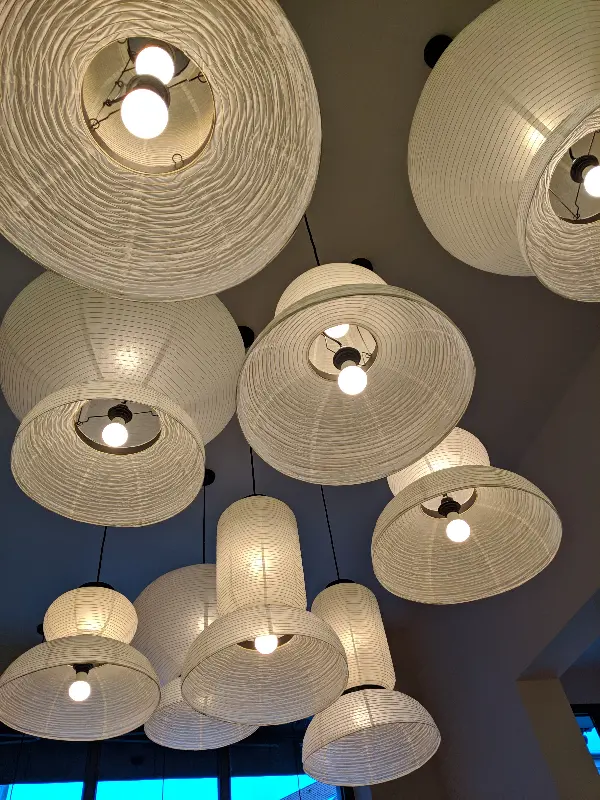 다양한 형태와 크기의 조명들이 은은하게 빛을 내며 공간에 따뜻함을 더합니다.