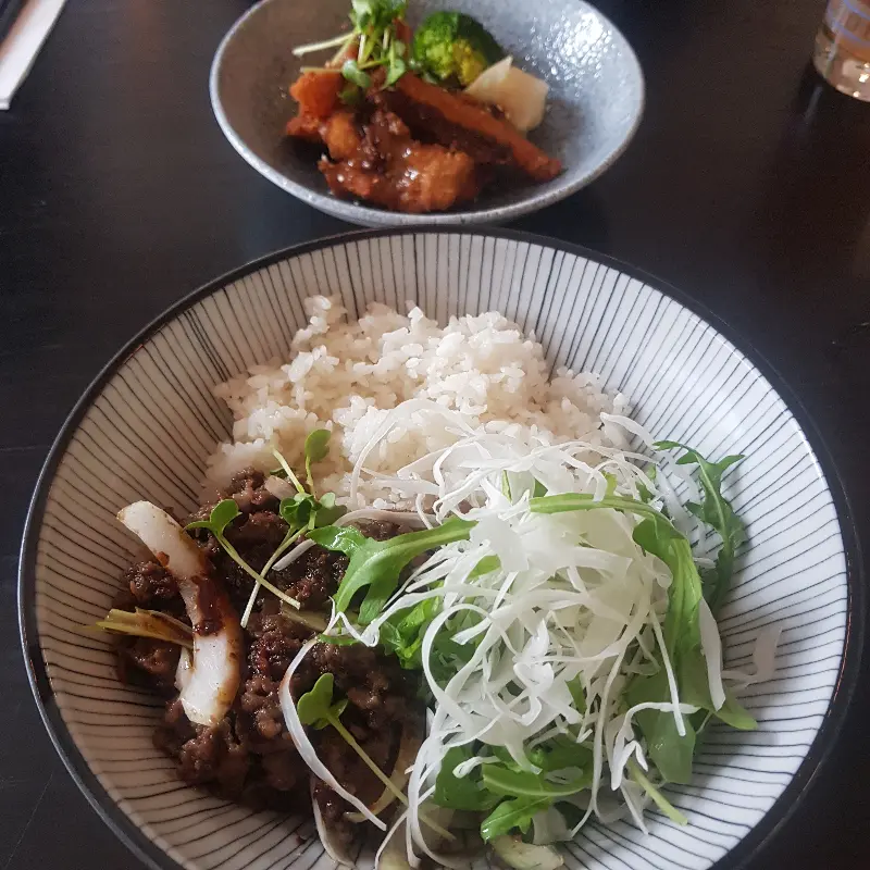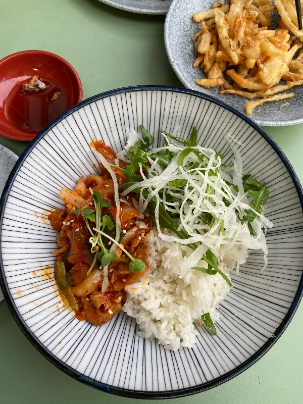 코린의 인기 메뉴 중 하나인 김삼볶은 볶음밥이 아닌 덮밥 형태로 제공됩니다. 제육볶음을 밥 위에 소복이 올려 낸 김삼볶은 든든한 한 끼 식사로 제격입니다. 매콤하면서도 달콤한 제육볶음은 밥과 환상적인 조화를 이루었습니다.