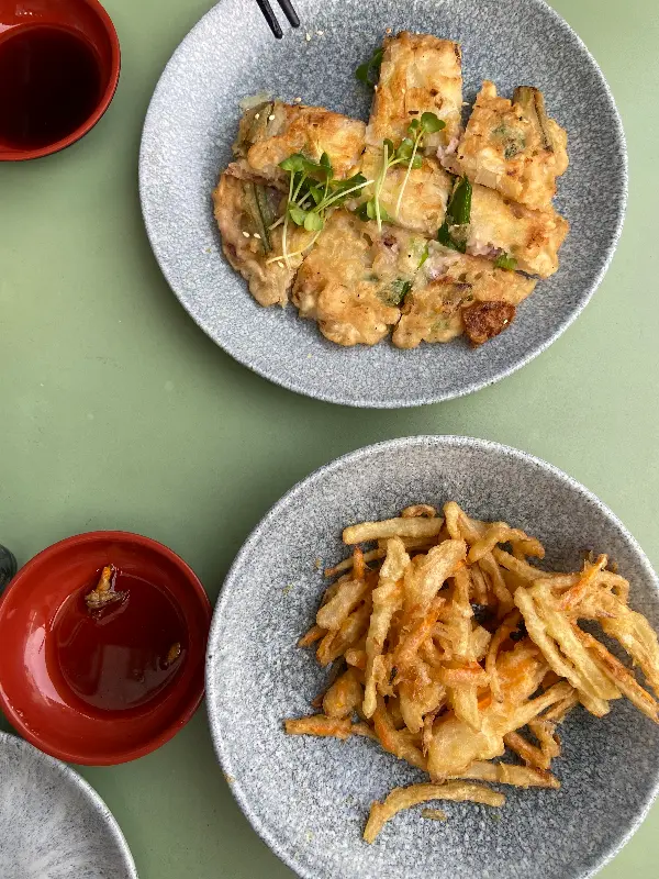 바삭하게 튀겨낸 야채튀김은 한국에서 먹던 맛 그대로입니다. 해물파전 역시 푸짐한 해물과 바삭한 식감이 조화롭게 어우러져 훌륭한 맛을 자랑합니다.