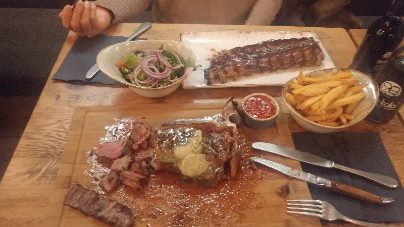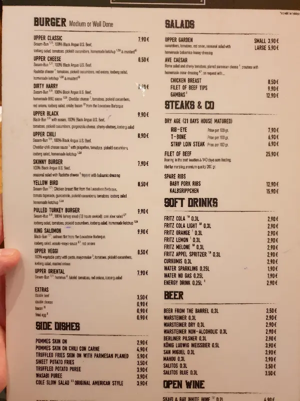 독일에서 덜 짠 음식을 찾기란 쉽지 않다는 이야기를 많이 들었습니다. 하지만 Upper Burger Grill에서는 그 걱정을 덜 수 있었습니다. 메뉴판을 살펴보니 버거뿐만 아니라 스테이크, 립 등 다양한 메뉴가 준비되어 있었습니다. 특히 눈에 띄는 건 티본 스테이크! 가격도 저렴한 편이라 고민 없이 주문했습니다.
