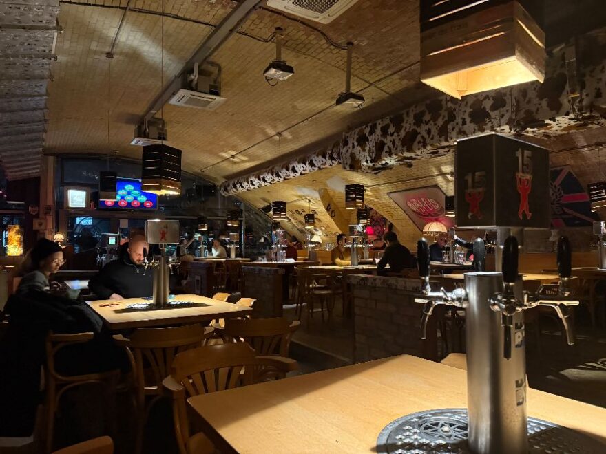 펍의 넓은 내부 공간을 보여주는 사진. 다양한 테이블과 좌석들이 준비되어 있다.