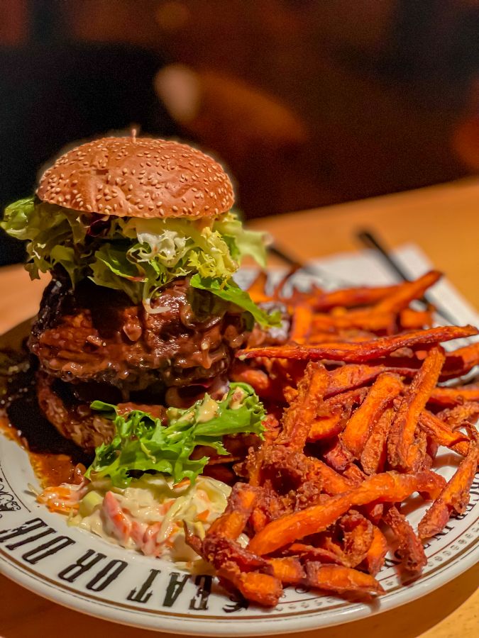 탐스러운 더블 패티 버거와 바삭한 감자튀김, 그리고 셀프 탭에서 갓 따른 시원한 맥주가 테이블 위를 풍성하게 채운다.