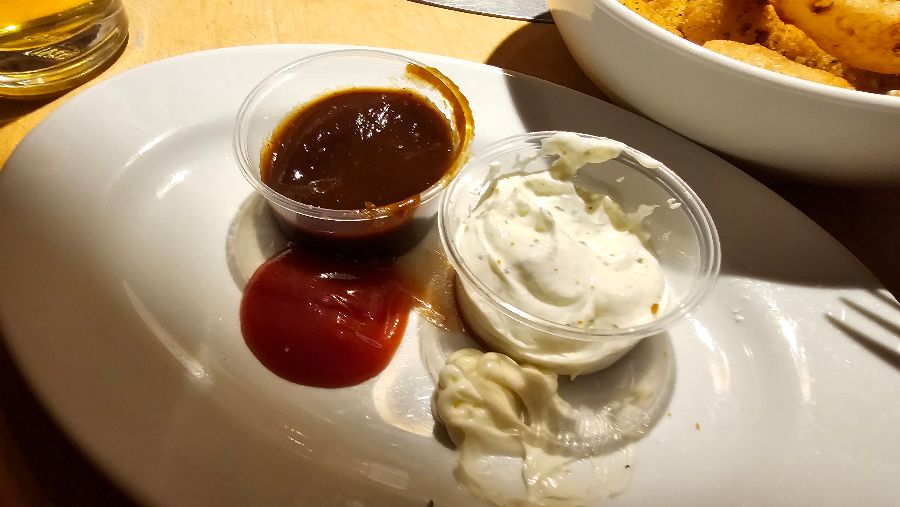 다양한 소스들이 담긴 작은 접시들. 튀김이나 버거와 함께 곁들이기 좋은 풍성한 선택지를 제공한다.