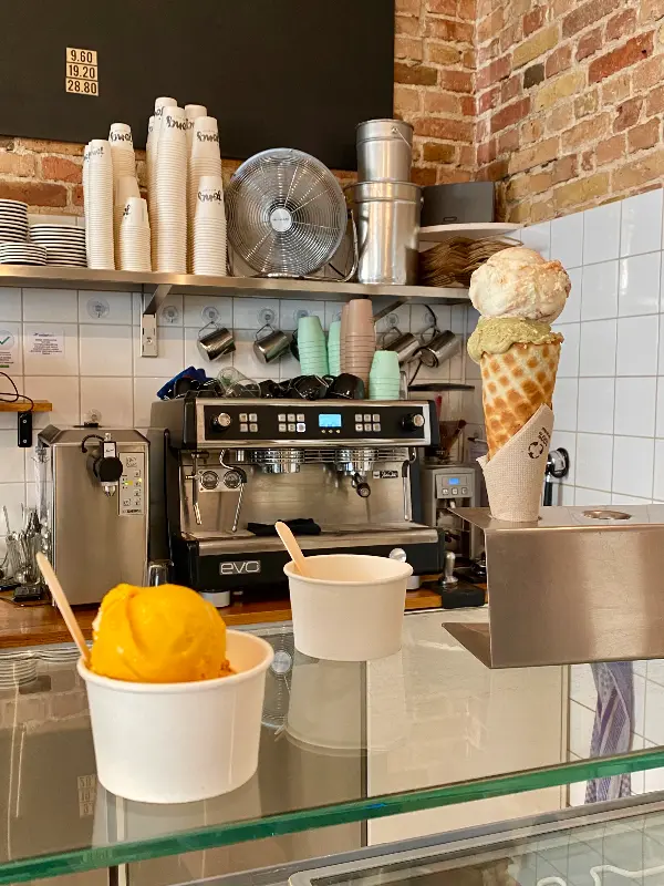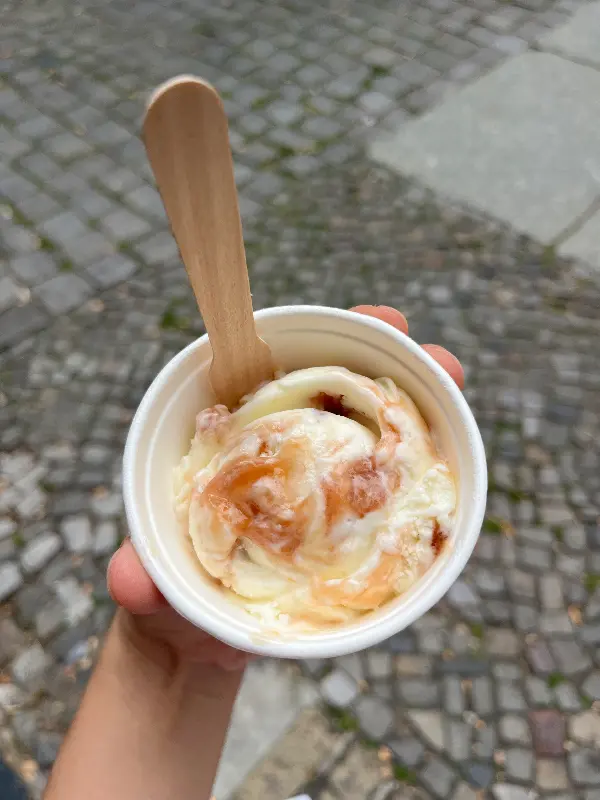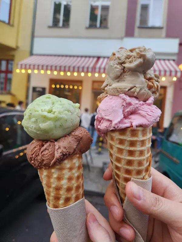 이미지 4를 보면, 숙련된 직원이 능숙한 솜씨로 아이스크림을 콘에 담아주는 모습을 볼 수 있다. 두 스쿱을 주문하면 꽤 높게 쌓아주는데, 보기만 해도 기분이 좋아진다. 아이스크림을 들고 가게 밖으로 나가 햇볕 아래서 먹는 그 맛은, 베를린 여행의 잊지 못할 추억으로 남았다.