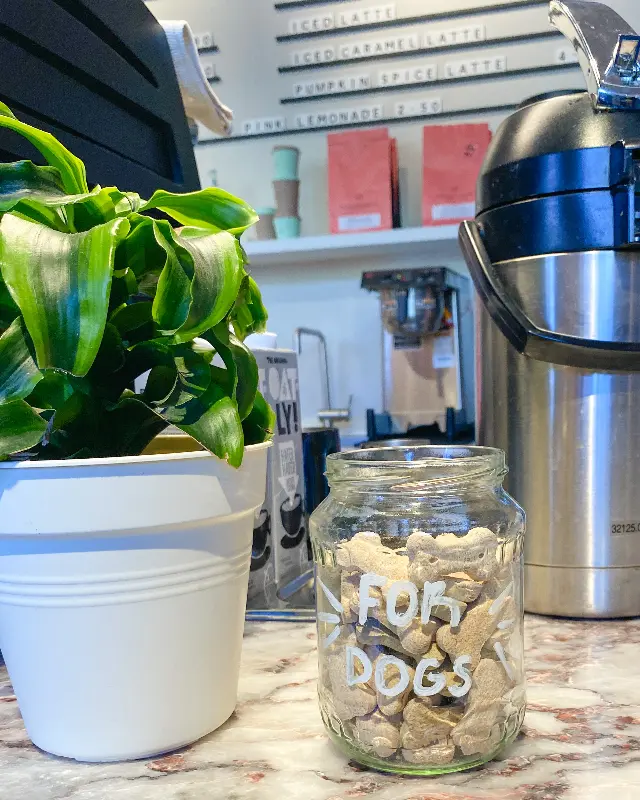 가게 내부는 깔끔하고 현대적인 인테리어로 꾸며져 있었습니다. 밝은 조명과 심플한 가구들이 편안한 분위기를 자아냈고, 곳곳에 놓인 식물들이 싱그러움을 더했습니다. 특히, 강아지 간식이 담긴 유리병이 눈에 띄었습니다. ‘FOR DOGS’라는 문구가 적힌 병을 보며, 이곳이 비건 도넛뿐만 아니라 동물에 대한 사랑도 실천하는 곳임을 느낄 수 있었습니다.