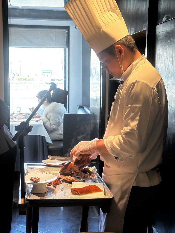집중하여 오리를 해체하는 셰프의 모습. 완벽한 북경오리 요리를 위한 숙련된 기술이 돋보입니다.