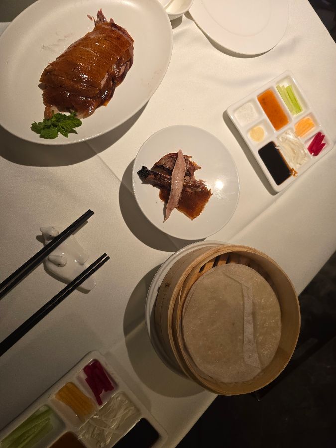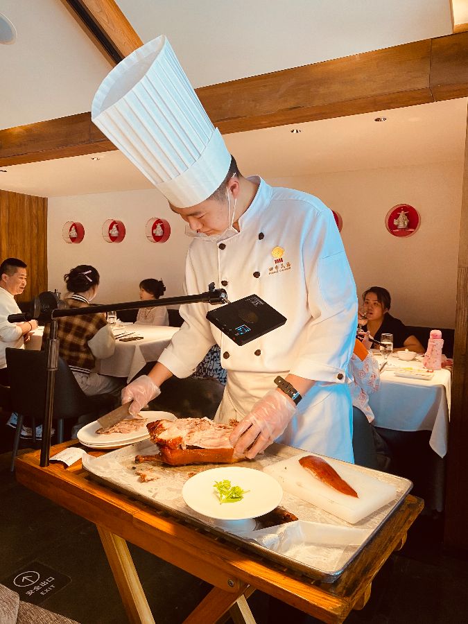 자리에 앉아 잠시 기다리면, 드디어 오늘의 주인공이 등장합니다. 노릇노릇하게 구워진 황금빛 오리가 테이블 위로 올려지는 순간, 탄성이 절로 터져 나옵니다. 그리고 잠시 후, 전문 셰프가 직접 테이블로 찾아와 눈앞에서 오리를 해체하기 시작합니다. 날렵한 칼놀림으로 껍질과 살코기를 능숙하게 분리하는 모습은 그 자체로 하나의 퍼포먼스이자 예술입니다.