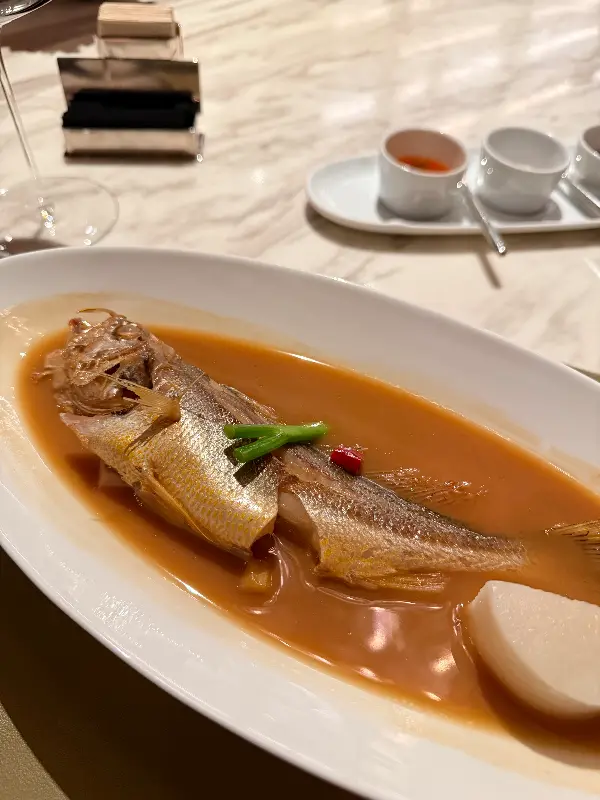 메인 코스는 Xin Rong Ji의 정수를 담아낸 요리들로 가득합니다. 훌륭한 수프는 깊고 풍부한 맛으로 속을 따뜻하게 채워주며, 환상적인 북경 오리는 바삭한 껍질과 촉촉한 속살의 조화가 일품입니다. 특히 황조기 조림 요리는 신선한 황조기의 담백한 맛과 특제 소스의 조화가 완벽하여 미식가들의 입맛을 사로잡습니다. Image 1을 보면, 윤기가 흐르는 황조기 위에 올려진 신선한 채소가 시각적인 아름다움까지 더합니다.