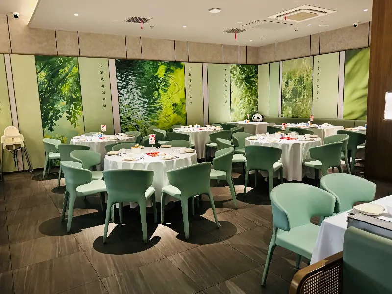 문을 열고 들어서는 순간, 은은한 조명과 깔끔하게 정돈된 테이블이 눈에 들어왔습니다. 레스토랑 내부는 차분한 색감으로 꾸며져 있었고, 곳곳에 놓인 판다 인형들이 귀여움을 더했죠. 특히 기억에 남는 건 벽면에 그려진 싱그러운 녹색 톤의 그림들이었습니다. 마치 숲 속에 있는 듯한 편안함을 주었죠.