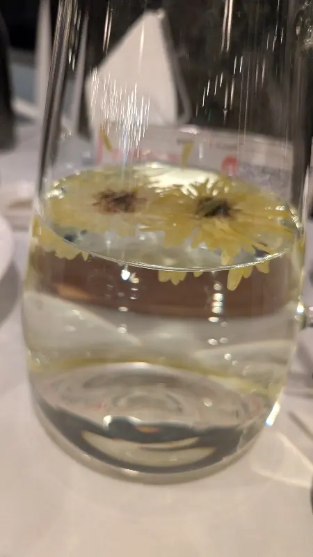 자리에 앉자마자 따뜻한 차 한 잔이 제공됩니다. 투명한 유리 주전자 안에는 노란 국화가 피어 있어 시각적인 즐거움까지 더합니다. 은은한 국화 향이 코를 간지럽히고, 따뜻한 차를 한 모금 마시니 입안 가득 퍼지는 향긋함이 몸과 마음을 편안하게 이완시켜 줍니다. 테이블 위에는 다양한 향신료들이 놓여 있어, 음식에 대한 기대감을 더욱 높여줍니다.