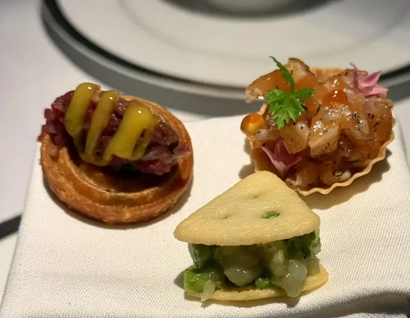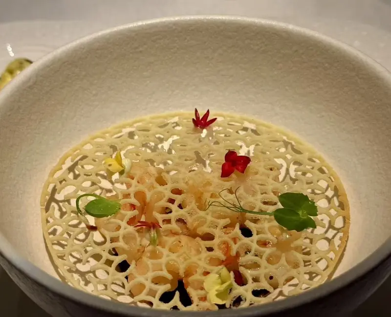 접시 위에 놓인 예술 작품 같은 요리들은 눈으로 먼저 즐거움을 선사했습니다. 특히 얇은 레이스처럼 섬세하게 만들어진 장식 아래 숨겨진 해산물 요리는 신선함과 풍미가 입안 가득 퍼져 나갔습니다.