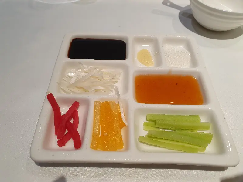 베이징덕과 함께 곁들여 먹는 다채로운 채소와 소스.