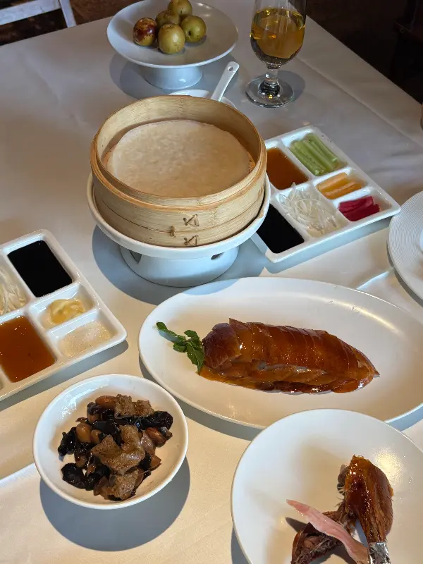 잠시 후, 눈 앞에 드디어 베이징덕이 등장했습니다. 윤기가 좔좔 흐르는 껍질과 먹기 좋게 손질된 오리, 그리고 함께 곁들여 먹을 각종 채소와 소스, 얇은 전병이 한 상 가득 차려졌습니다. 마치 예술 작품을 보는 듯한 아름다운 모습에 감탄사가 절로 나왔습니다.