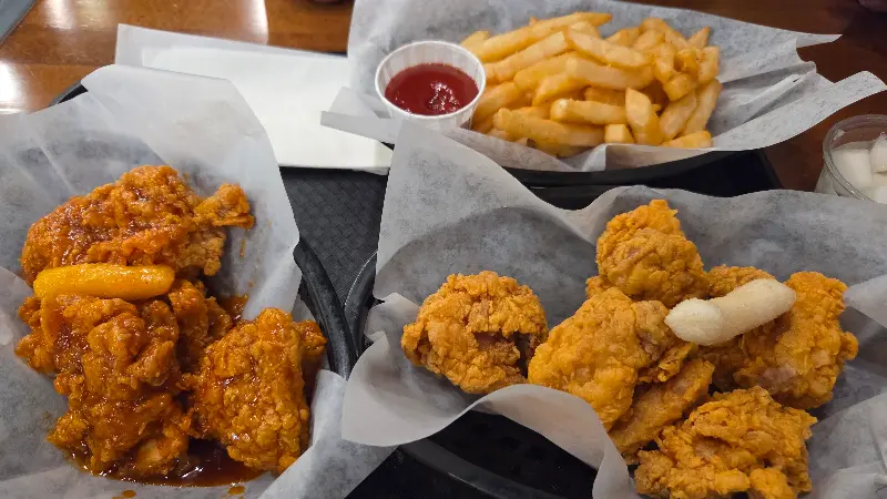 양념 치킨 한 조각을 입에 넣으니, 매콤달콤한 양념이 입안 가득 퍼졌다. 쫄깃한 떡도 함께 들어있어 씹는 재미를 더했다. 후라이드 치킨은 겉은 바삭하고 속은 촉촉해서, 튀김옷의 고소함과 닭고기의 담백함이 완벽하게 어우러졌다. 특히 이곳은 치킨 사이즈가 한국보다 크다는 리뷰처럼, 정말 푸짐한 양을 자랑했다.