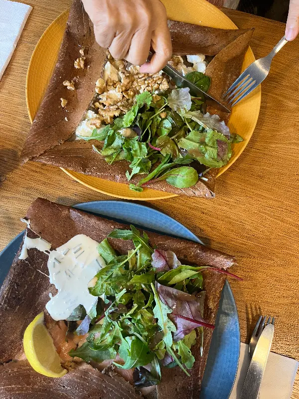Le Petit Breton에 들어서자, 가장 먼저 눈에 띈 것은 다채로운 크레페 메뉴였다. 클래식한 햄과 치즈 크레페부터 연어, 바나나, 초콜릿 등 다양한 토핑이 올라간 크레페까지, 그 종류만 해도 수십 가지는 되어 보였다. 결정 장애가 있는 나에게는 너무나 가혹한 선택의 시간. 고민 끝에, 가장 인기 있다는 연어 크레페와 달콤한 바나나 크레페를 주문했다.
