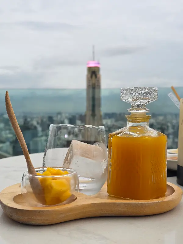 Cru Champagne의 가장 큰 매력은 단연 야경이다. 59층 높이에서 바라보는 방콕의 전경은 그야말로 숨 막힐 듯 아름다웠다. 반짝이는 불빛들이 마치 은하수처럼 펼쳐져 있었고, 시원한 바람이 불어와 더위를 잊게 해주었다. 가격은 다소 비싼 편이지만, 그만한 가치가 있다고 생각한다.