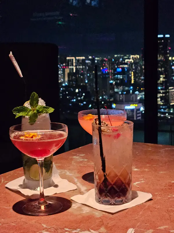 리뷰에서 “자카르타 최고의 루프탑 라운지 중 하나”라는 평가를 받았다는 점을 실감할 수 있었습니다. 단순히 높은 곳에서 도시를 내려다보는 것이 아니라, 도시의 에너지와 생명력을 온몸으로 느낄 수 있는 특별한 경험이었습니다. 특히 바람이 살랑살랑 불어오는 야외 테라스 좌석은 더욱 낭만적인 분위기를 자아냈습니다.