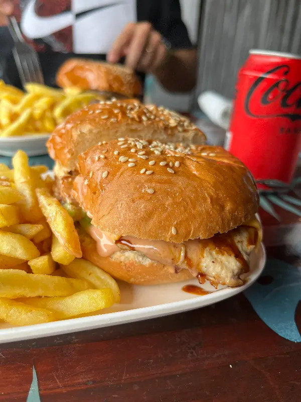 메뉴를 고심하다 푸아송 크뤼와 생선버거를 주문했다. 잠시 후, 테이블 위로 푸짐한 양의 음식들이 차려졌다. 푸아송 크뤼는 신선한 참치를 코코넛 밀크에 버무린 타히티 전통 음식으로, 입안 가득 퍼지는 코코넛의 풍미와 참치의 신선함이 환상적인 조화를 이루었다. 특히 톡 쏘는 라임 향이 더해져, 느끼함 없이 깔끔하게 즐길 수 있었다.