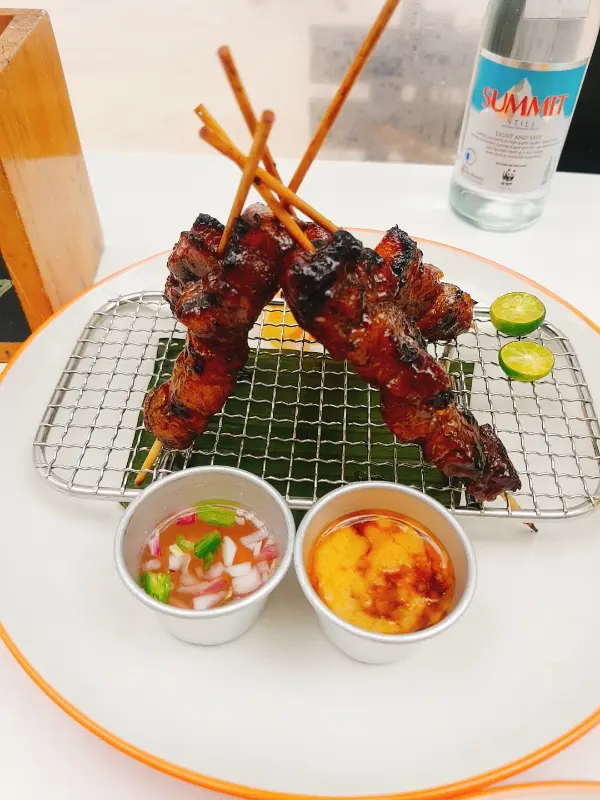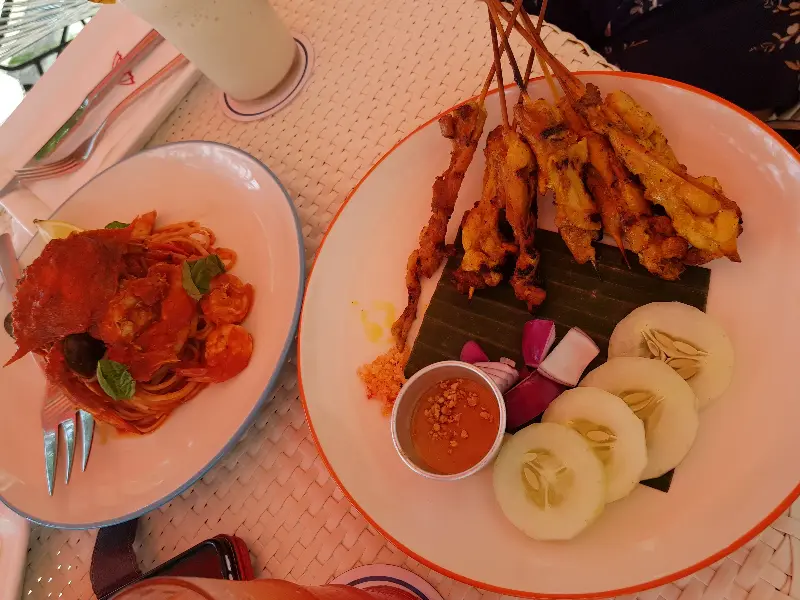 메뉴판을 펼쳐 들자 다양한 종류의 음식들이 눈에 띄었다. 필리핀 전통 음식부터 서양식 요리까지, 폭넓은 선택지가 만족스러웠다. 특히 비건 메뉴도 준비되어 있다는 점이 인상적이었다. 고민 끝에 해산물 스파게티와 치킨 꼬치, 그리고 시원한 음료 두 잔을 주문했다. 주문 후 얼마 지나지 않아, 먹음직스러운 요리들이 테이블 위를 가득 채웠다.