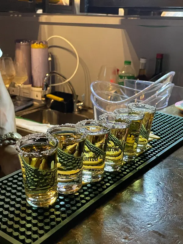 일렬로 정돈된 데낄라 샷. 잔 주변에 뿌려진 소금이 입맛을 돋운다.