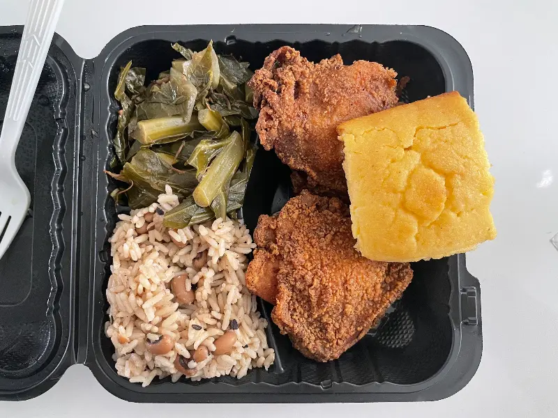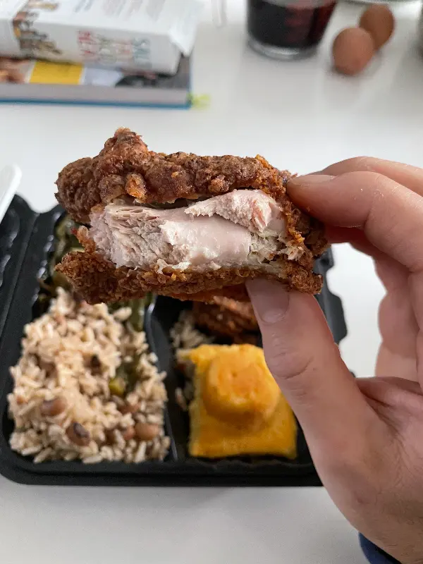 함께 나온 콘브레드는 달콤함으로 입안을 감싸주며, 프라이드 치킨의 짭짤함을 완벽하게 중화시켜 주었다. 밥과 콩은 완벽하게 양념이 되어 있어서, 굳이 다른 반찬이 필요 없을 정도였다.