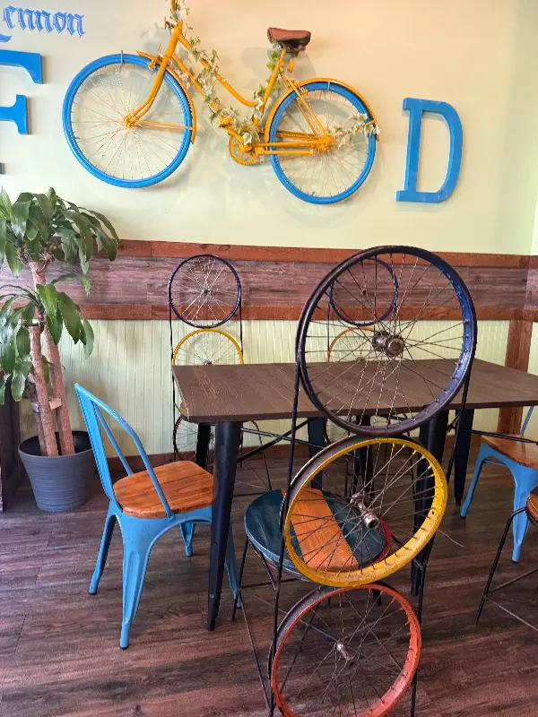 벽에는 파란색과 노란색으로 포인트를 준 자전거 모형이 걸려 있었고, 알록달록한 의자들이 놓여 있었다. 평범한 식당과는 다른, 개성 넘치는 인테리어가 눈길을 사로잡았다. 창가 자리에 앉으니, 밖에는 노란 꽃들이 활짝 피어 있었다. 따뜻한 햇살이 쏟아지는 창가에 앉아 있으니, 마치 소풍을 온 듯한 기분이었다.