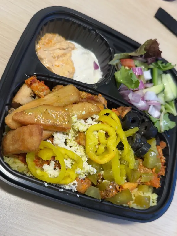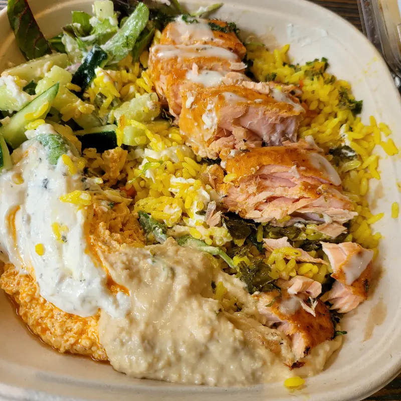 드디어 기다리고 기다리던 자이로 볼이 눈 앞에 놓였다. 윤기가 자르르 흐르는 연어와 신선한 채소, 그리고 매콤한 페타 치즈가 조화롭게 어우러진 모습이 시각적으로도 훌륭했다. 갓 구운 듯 따뜻한 피타 빵도 함께 나왔다.