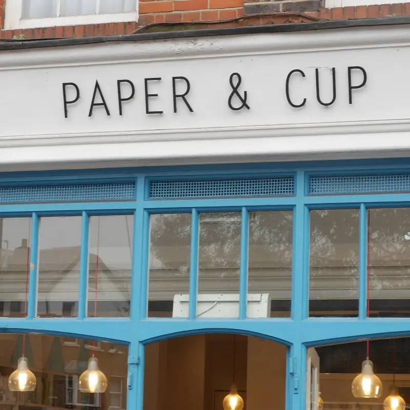 본미 포트 포인트 지점은 밝고 현대적인 분위기가 인상적이었습니다. 전면의 푸른색 창틀과 “PAPER & CUP”이라고 쓰여진 간판은 멀리서도 눈에 띄었고, 내부의 나무 소재 인테리어와 은은한 조명은 아늑한 느낌을 더했습니다.