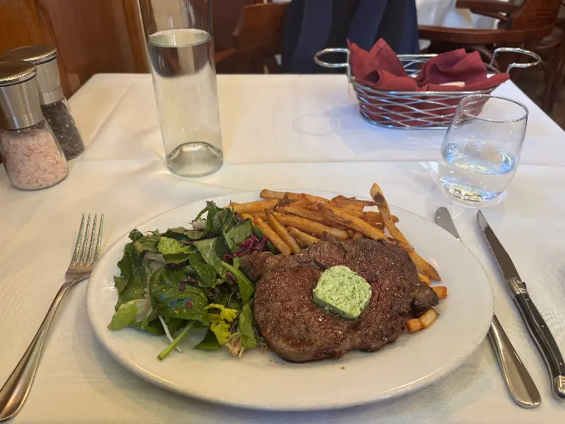 문을 열자, 친절한 미소로 맞이하는 직원들의 모습에서부터 좋은 기운이 느껴집니다. “봉주르!” 하는 프랑스어 인사 대신, 편안한 영어로 자리를 안내받았습니다. 테이블 위에는 깨끗하게 닦인 유리잔과 은색 식기가 가지런히 놓여 있었고, 붉은색 냅킨이 포인트가 되어 테이블 세팅의 완성도를 높였습니다. 벽돌로 마감된 벽과 은은한 조명이 어우러져 아늑하면서도 고급스러운 분위기를 자아냅니다. 한쪽 벽면에는 다양한 와인 병들이 진열되어 있어, 이곳이 와인에도 일가견이 있는 곳임을 짐작하게 합니다. 한낮의 햇살이 붉은 파라솔을 통과해 테이블 위로 부드럽게 쏟아지는 모습은, 마치 프랑스의 한적한 레스토랑에 와 있는 듯한 착각을 불러일으킵니다.