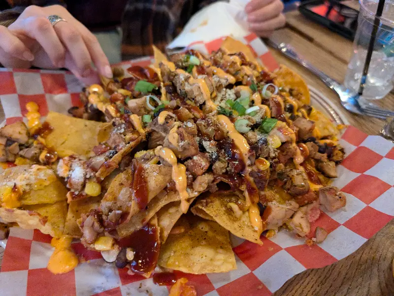 가장 먼저 눈길을 사로잡은 것은 슈퍼 나초였다. 사진에서 볼 수 있듯이, 나초는 체다 치즈, 몬테레이 잭 치즈, 피코 데 갈로, 할라피뇨, 사워크림, 구아카몰 등 다양한 토핑으로 푸짐하게 덮여 있었다. 바삭한 나초 위에 부드러운 치즈와 신선한 채소들이 어우러져 환상적인 맛을 선사했다. 특히, The Point만의 특별한 레시피로 만들어진 듯한 사워크림은 나초의 풍미를 한층 더 깊게 만들어주었다. 양이 매우 푸짐해서 두 명이서 먹기에도 충분했으며, 가격 또한 15달러로 합리적이었다.