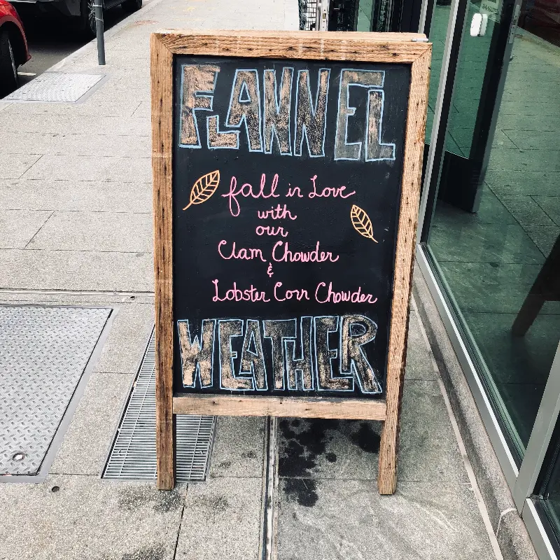 Lukes Lobster 앞에 세워진 입간판. Clam Chowder & Lobster Corn Chowder를 홍보하고 있다.