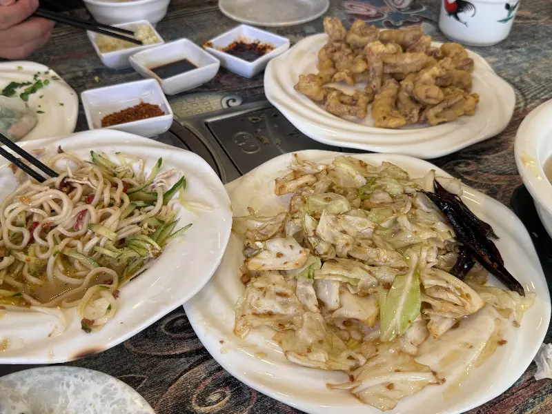다양한 요리들이 테이블 가득 차려진 모습. 훠궈, 꿔바로우, 양배추볶음 등 다채로운 메뉴를 즐길 수 있다.