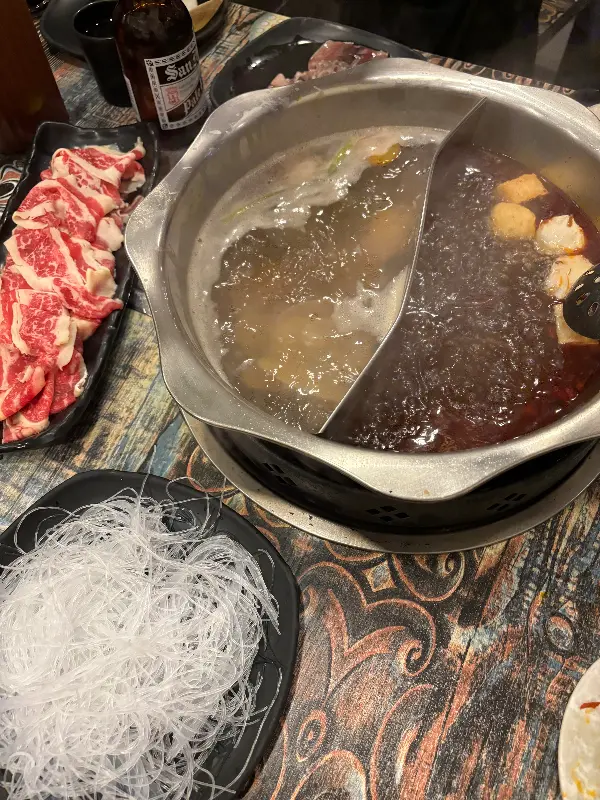 가게 안은 중국인 손님들로 가득했고, 테이블은 10개 남짓 놓여 있었다. 홍탕과 버섯탕, 두 가지 육수만 제공되는 점은 아쉬웠지만, 국물 맛은 정말 훌륭했다. 특히 홍탕은 하이디라오의 청유 훠궈 못지않은 깊은 맛을 자랑했다.