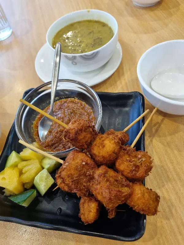 사테 꼬치는 겉은 바삭하고 속은 촉촉한 완벽한 조화를 자랑했다. 꼬치에 꽂힌 채 튀겨진 채식 재료들은 짭짤하면서도 고소한 풍미를 뽐냈다. 함께 제공된 땅콩 소스는 꼬치의 맛을 더욱 풍성하게 만들어 주었고, 신선한 오이와 파인애플은 입안을 상큼하게 정돈해 주었다.