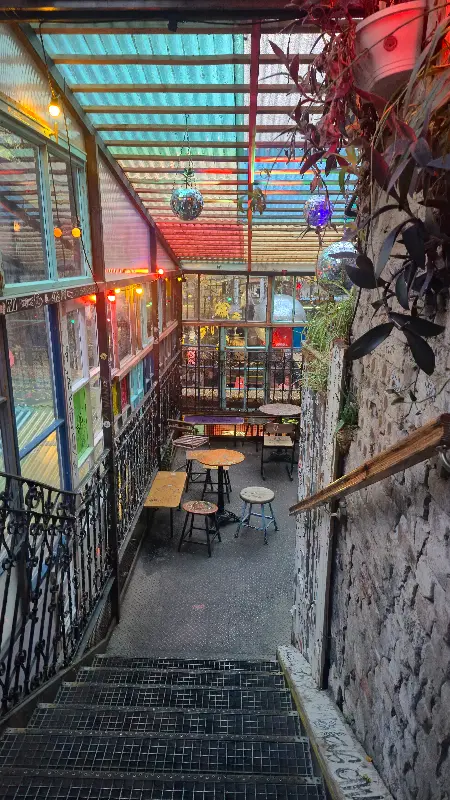 이미지 1은 루인 바의 작은 정원을 보여준다. 건물 밖으로 보이는 풍경과 식물들이 어우러져 도심 속 작은 오아시스 같은 느낌을 준다. 낡은 건물과 자연의 조화는 루인 바의 매력을 더욱 돋보이게 한다.