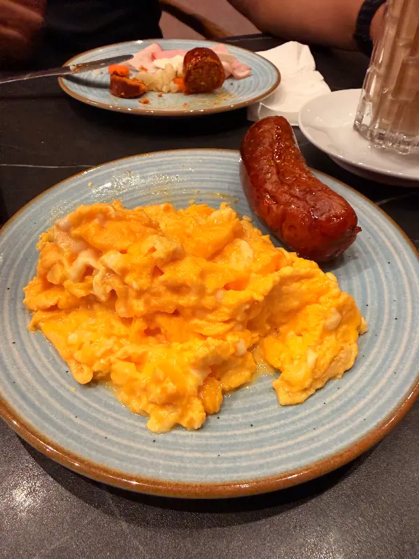 윤기가 흐르는 소시지와 부드러운 스크램블 에그의 조합은 완벽했습니다.