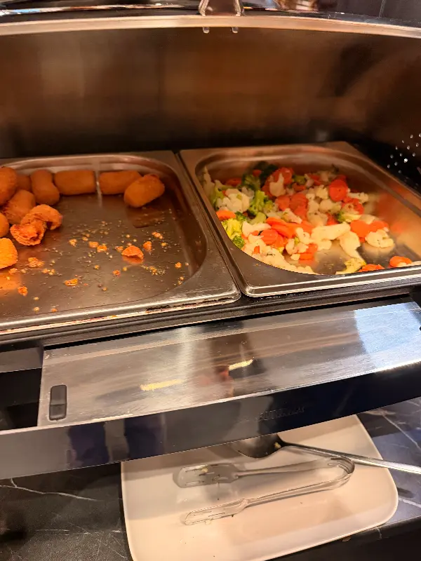 따뜻한 조명 아래 펼쳐진 뷔페는 풍성한 아침 식사를 기대하게 만들었습니다.